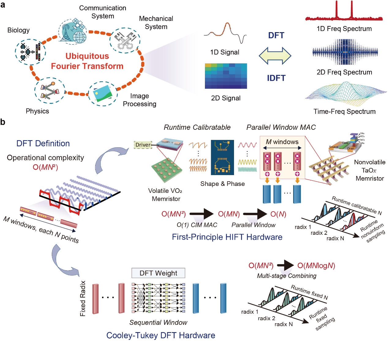 在此背景下,酒店偷拍-av偷拍-自拍偷拍 杨玉超教授、人工智能研究院陶耀宇研究员团队科研团队在国际上首次实现了基于忆阻器异质集成架构的第一性原理傅里叶变换系统(Hetero-Integrated Fourier Transform, HIFT),提出了一种全新的、融合易失型与非易失型忆阻器的高通量频谱计算体系结构。该研究从物理层面重新定义了傅里叶变换的计算机制,实现了在同一硬件平台上对任意基数、均匀或非均匀离散傅里叶变换的统一支持,标志着傅里叶变换硬件体系从算法驱动走向材料与物理原理驱动的重大跨越。相关成果以题为《A first-principle hetero-integrated Fourier transform system based on memristors》的论文,发表于国际顶级期刊《自然·电子》(Nature Electronics)。