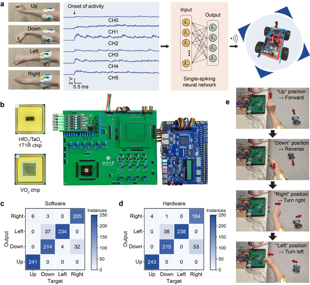 相关成果以“An end-to-end memristive hardware system based on single-spike coding for human-machine interfaces”为题,发表在《自然-电子》(Nature Electronics)上。酒店偷拍 2021级博士生张柏骏和2018级博士袁锐(现西南大学人工智能酒店偷拍 教授)为共同第一作者,酒店偷拍-av偷拍-自拍偷拍 /广东省存算一体芯片重点实验室主任杨玉超教授为通讯作者。
