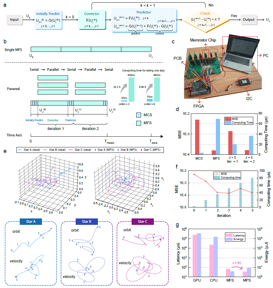 该系统基于实际流片的忆阻器芯片,结合PCB与FPGA搭建了端到端的应用演示平台,全面验证了其在典型ODE求解任务中的优越性能。该系统采用了三种不同的求解模式,以应对不同精度和速度需求的ODE问题。粗求解器利用忆阻器阵列的模拟计算能力,成功求解了指数函数问题,适用于对速度要求较高但精度要求较低的场景。细求解器则通过数字计算,精确求解了洛伦兹方程,能够在保证高精度的同时,较为平衡地控制计算开销。并行求解器则采用了粗细混合的前瞻性求解策略,成功求解了经典的三体问题,通过并行计算大幅提升了求解速度和精度,适用于复杂的高并发任务。实验结果表明,这三种求解模式在不同任务中均表现出了优异的性能,相较于现有的CPU/GPU系统,该系统在三类经典ODE问题上实现了高达601~6.92×103倍的速度提升、1.71×103~3.93×103倍的能效提升,充分展示了忆阻器存算一体架构在常微分方程求解中的强大潜力,进一步证明了这一创新架构的前景。
