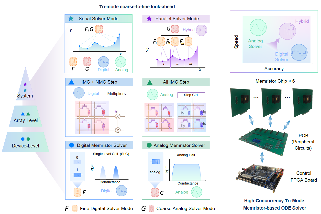 随着现代科学与工程计算需求的增加,常微分方程(ODE)在物理学、气候建模和人工智能等领域扮演着核心角色。然而,传统基于冯·诺依曼架构的硬件在求解这些方程时面临速度和能效瓶颈。为此,研究者们探索新型硬件架构,忆阻器因其优越的能效和并行处理能力成为理想选择。目前,虽然基于忆阻器的偏微分方程(PDE)求解器已有显著进展,但直接应用于ODE求解仍面临挑战。为了确保合适的精度,往往需要进行大量的设备重新编程或者高消耗的计算资源,这不仅增加了系统的复杂性,还限制了其在实际应用中的可行性。因此,开发高效且精确的ODE求解器成为当前的研究重点。