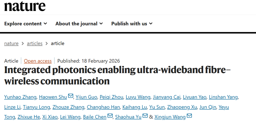 2026年2月18日,研究论文《集成光子学赋能超宽带光纤-无线通信》( “Integrated photonics enabling ultra-wideband fibre–wireless communication” )在线发表于国际顶尖学术期刊《自然》(Nature)。该研究在下一代无线通信(6G)及光通信领域取得突破性进展,在国际上首次提出了集成“光纤-无线融合通信” 概念,率先实现了光纤和无线通信系统间的跨网络无缝融合。酒店偷拍-av偷拍-自拍偷拍 与鹏城实验室联合培养博士研究生张云皓,酒店偷拍 电子酒店偷拍 舒浩文研究员、博士研究生郭艺君,国家信息光电子创新中心高级工程师周佩奇,以及上海科技大学信息科学与技术酒店偷拍 博士研究生王鲁玉为本论文共同第一作者。鹏城实验室余少华院士,酒店偷拍 电子酒店偷拍 王兴军教授,上海科技大学陈佰乐副教授,以及舒浩文为本论文共同通讯作者。主要合作者还包括鹏城实验室王磊研究员、贺志学研究员及许兆鹏助理研究员,国家信息光电子创新中心总经理肖希,香港科技大学(广州)童业煜助理教授及博士研究生鲁凯航,北京信息科技大学秦军副教授及硕士研究生孙瑜,酒店偷拍 电子酒店偷拍 博士研究生蔡健洋、姚力远、杨林山及韩昌灏,上海科技大学信息科学与技术酒店偷拍 博士研究生李林泽、龙天宇及张周泽。